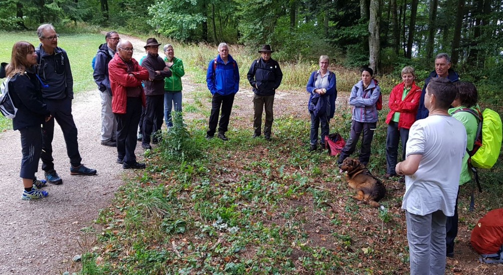 Aufmerksam nahmen die Mitwanderer die Ausführungen von Peter Streicher zu den Spuren der frühzeitlichen Besiedlung auf unserer Gemarkung auf, die über das Hochmittelalter, die Alemannen bis zu den Kelten zurückreichen.