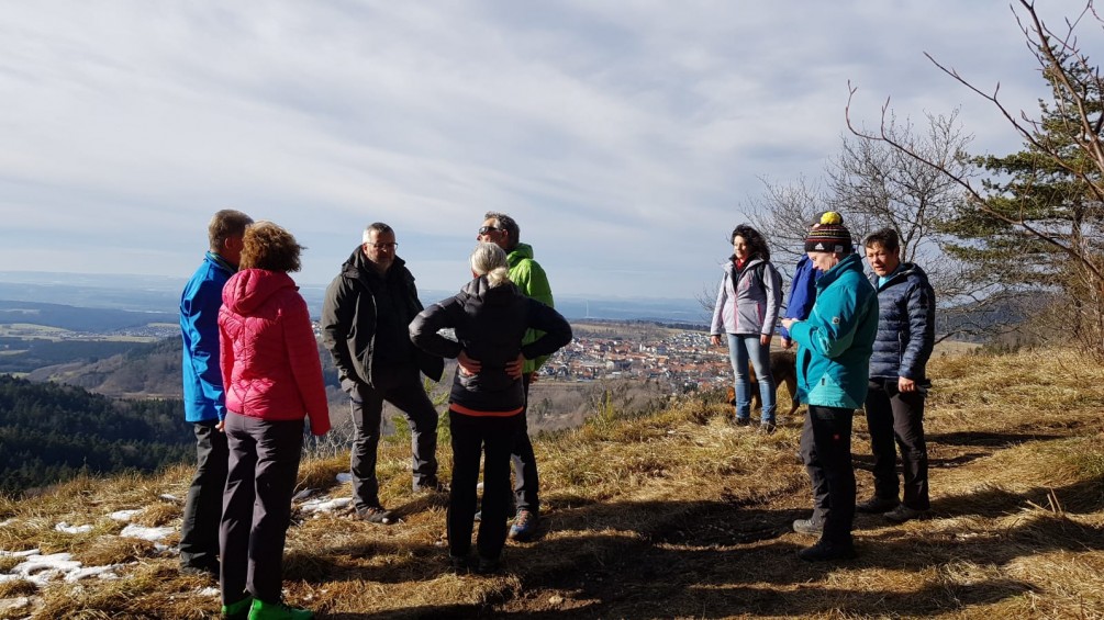 8 Wanderer sind über den Wanderweg nach Spaichingen, weiter entlang des Trimm-Dich-Pfad und Panoramaweg oberhalb Balgheim, hinauf zum Aussichtpunkt Weissen mit herrlichem Ausblick ins Primtal und auf den Dreifaltigkeitsberg gewandert. Hier sind weitere 8 Mitglieder zur Gruppe gestoßen. Im Pilgersaal wurde das Wanderjahr durch unseren Gauobmann Klaus Butschle, weiteren Beiträgen und Musikunterhaltung eröffnet. Der Rückweg führte Richtung Klippeneck, zur Kreuzsteighütte und über die Kreuzsteige zum Schützenhaus (Schlußeinkehr).