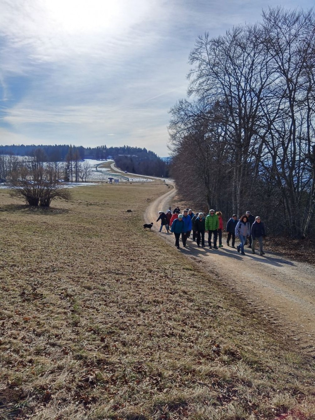 Leider wurde aus der geplanten Schneeschuhwanderung mangels Schnee nichts. So führte uns unsere Wanderführerin Silvia Hittinger vom Treffpunkt „Wanderparkplatz Klippeneck“ am Traufweg entlang zum Aussichtpunkt Weißes Kreuz oberhalb Gosheim. Nach kurzem Aufenthalt ging es weiter zur Einkehr in die Gosheimer Skihütte. Der Rückweg wurde bei aufziehendem Sturm „Sabine“ angetreten. Entlang des Flugplatzes ging es zurück zum Wanderparkplatz. 21 Teilnehmer und 2 Hunde.