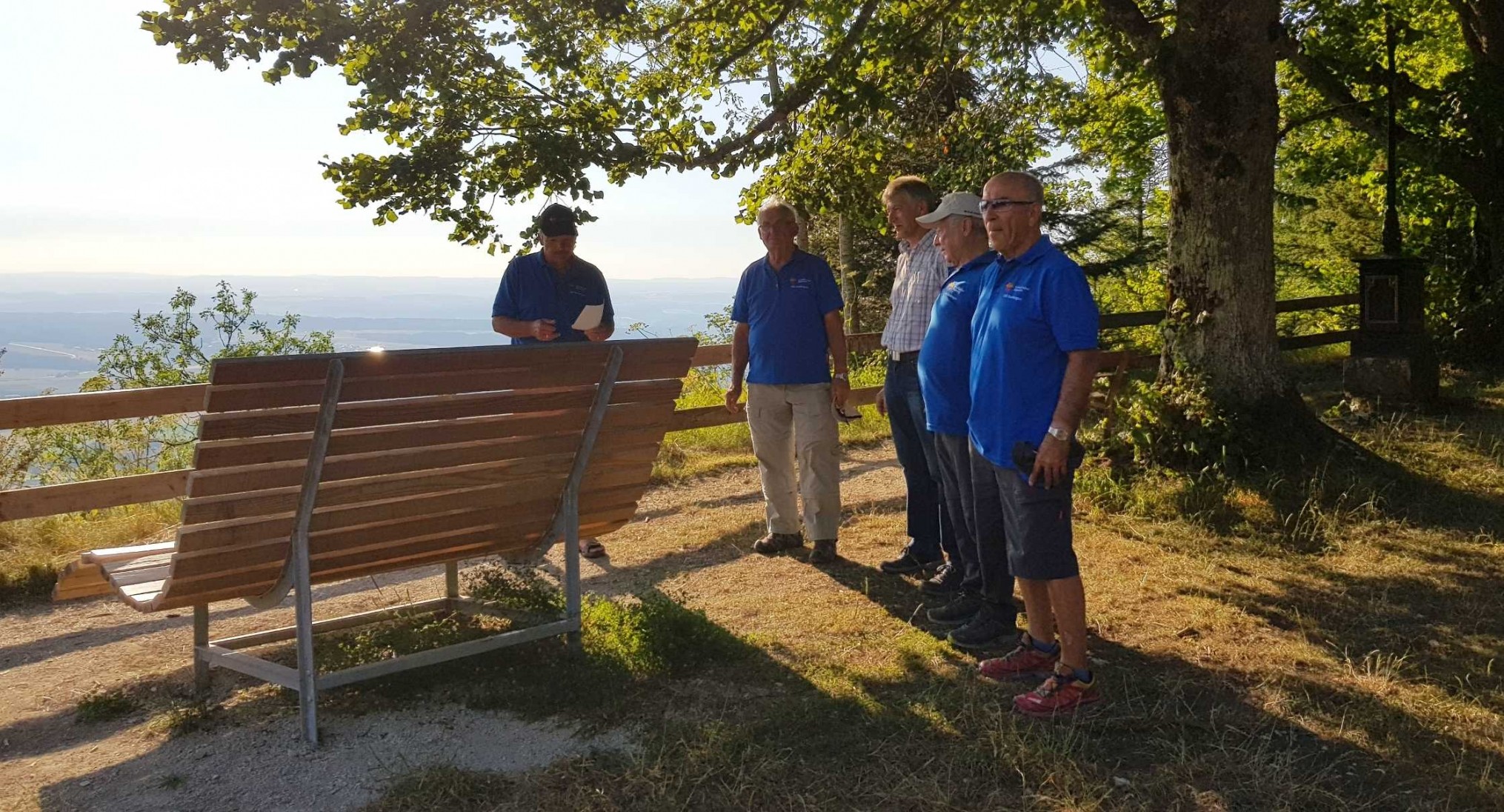 Spaziergängern und Wanderern ist sie schon ein bekanntes Bild, unsere Wellenliege am Rastplatz Kreuzsteige zwischen Klippeneck und Dreifaltigkeitsberg. Viele konnten auf ihr schon das eindrucksvolle Panorama genießen. Mit einem kleinen Festakt übergaben wir vom Albverein Denkingen unsere Panorama-Liege Ende Juli nun offiziell ihrer Bestimmung.