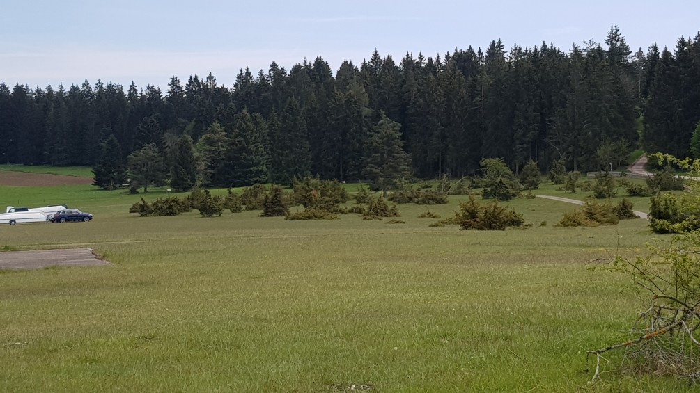 Unsere Pflegemaßnahmen erstrecken sich zusätzlich auf das Landschaftsschutzgebiet Heuberger Wasen auf der Hochfläche, hier insbesondere die Heidelandschaft südlich des Segelfluggeländes mit ihrer Wacholderheide, Magerrasen, Silberdistelbewuchs u.a..